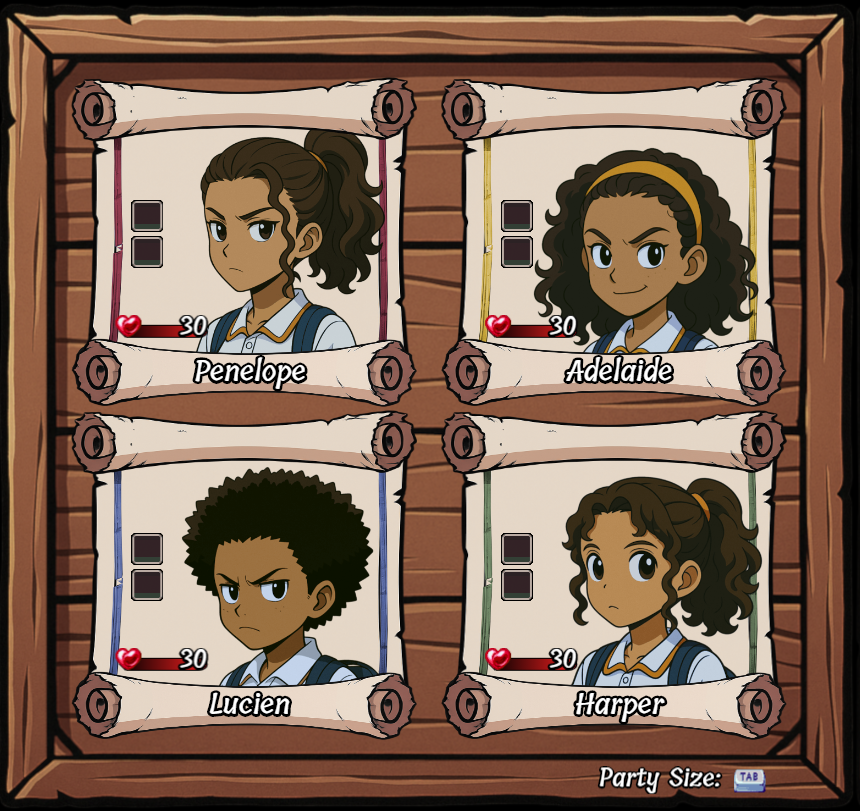 The last one for this devlog is something a little bit more visual. It wasn't necessarily a bug, but the idea was how do I make sure that what a player is seeing in the main menu, how they're interpreting things in battle, also matches the overworld sprites. So I rigged up a quick script that makes sure that the row order, so the way that the party is set up in battle is also the same order that you're gonna kinda see them walking around on the overview. So if, for example, you have Penny and Addy are index zero and one, the first two characters are gonna be top row, they're gonna be the first and second characters that you see, and then you have Lucien and Harper that would be after that in the remainder. It's a little fix. It's not something monumentous. It's not something that actually affects gameplay, but just from kind of a lore perspective, you would expect the row pairs, the row partners to be next to each other as they're kind of navigating the world and walking around. It was important enough for me, so I figure somebody else might also be excited about that news, so just felt the need to mention it.